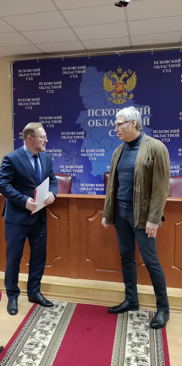 Также Олег Викторович сообщил об уходе на новую работу руководителя аппарата областного суда Сергея Валерьевича Шерстобитова, поблагодарил его за труд на благо судебной системы и вручил заслуженные награды: почетную грамоту Судебного департамента при Верховном Суде Российской Федерации, почетную грамоту Псковского областного суда, совета судей Псковской области и Управления Судебного департамента в Псковской области.